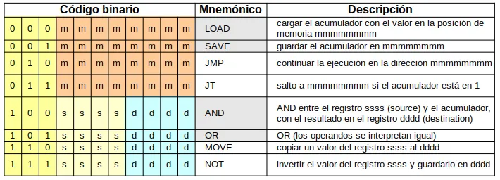 LOADySAVEnos permite acceder a datos a memoria, con el tercer bit indicando la dirección (carga o graba).JMPyJTson saltos en la ejecución del programa, con el tercer bit indicando si es condicional al estado del acumulador o no.ANDyORson las operaciones lógicas básicas entre un registro y el acumulador con el resultado en otro (o el mismo) registro.MOVEyNOT, copian un registro en otro donde el tercer bit nos dice si ha de invertirse en el proceso.